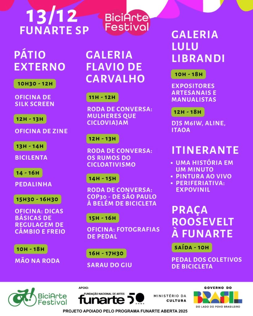 No dia 13 de dezembro, das 10h às 18h, a Funarte SP recebe mais uma edição do BiciArteFestival, um encontro aberto para quem quer passar o dia entre arte, criatividade e novas formas de ocupar a cidade. ✨